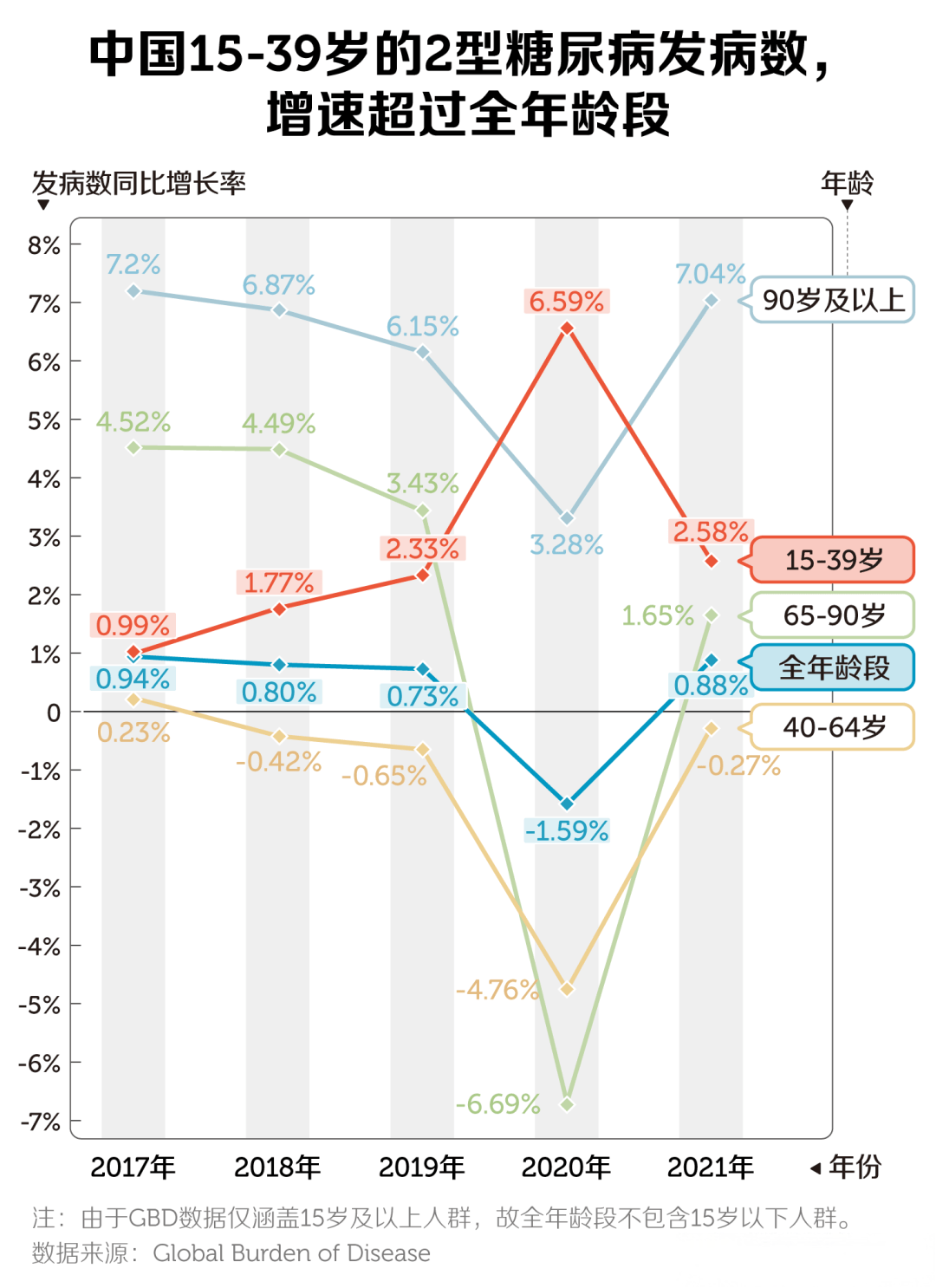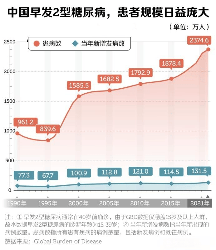 2021 年全球统计数据表明,成年人糖尿病患病率已达 10%。而中国 15-39 岁早发 2 型糖尿病患者数量,从 1990 年的 961.2 万激增至 2374.6 万,增幅高达 147%。