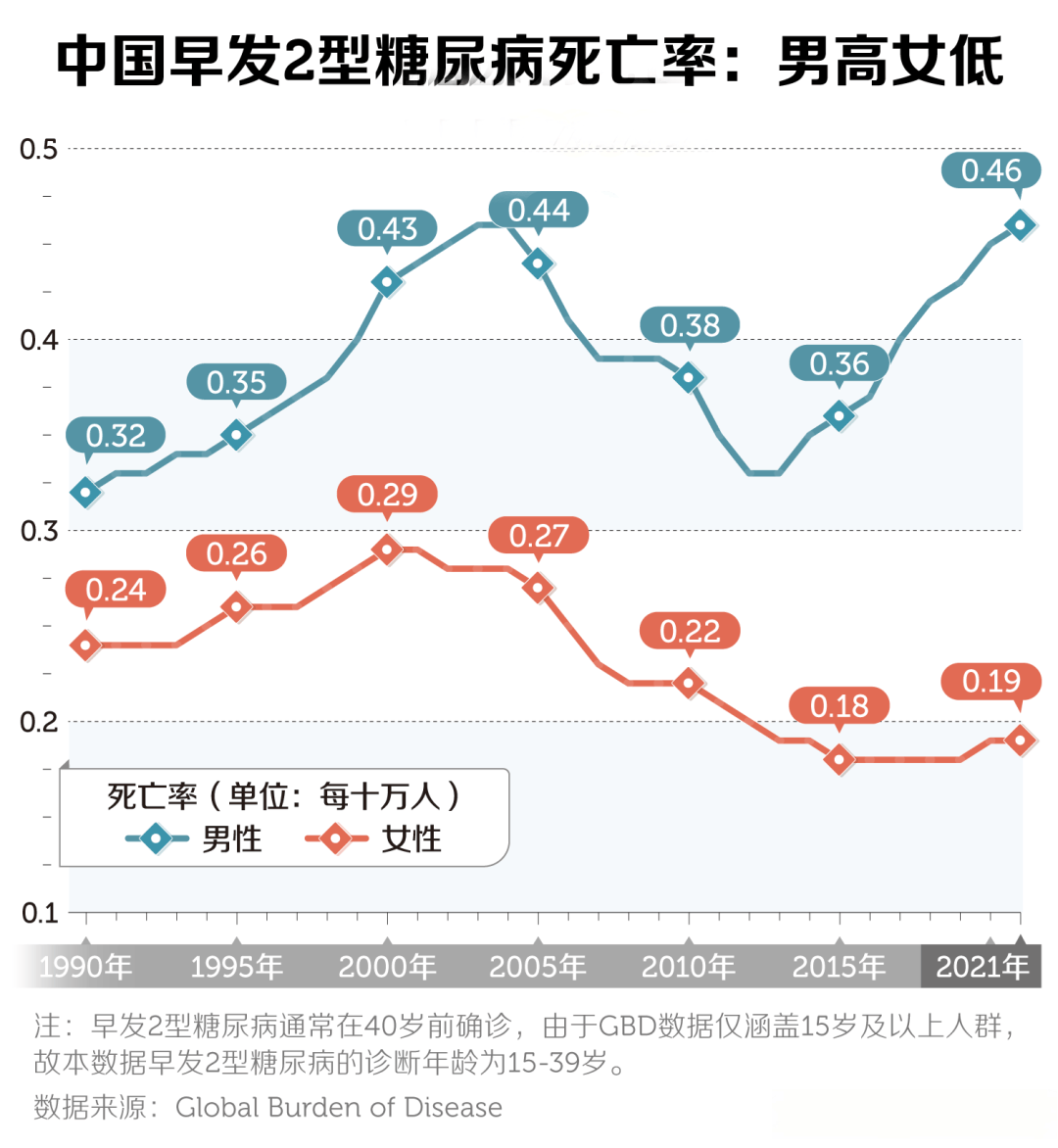 男性身材走形往往被默许或忽视,而女性受身材焦虑影响,更愿意主动管理体重。这种差异直接导致男性早发糖尿病死亡率达到女性的 2.4 倍,且男女之间的死亡差距仍在不断扩大。
