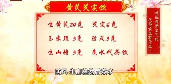 做法:取20克生黄芪、6克芡实、3克玉米须、3克防风、3克生山楂,煮水代茶饮即可。