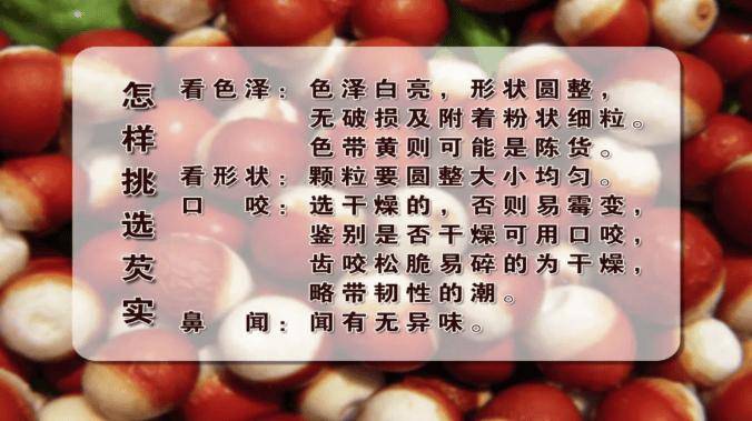 看质感:取一粒芡实咬一下,如果松脆易碎说明它较为干燥;如果咬起来带韧性那可能已经受潮了,买回家容易霉变。