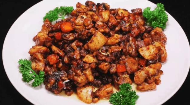做法:起油锅,下入胡萝卜丁翻炒片刻,盛起后下入核桃仁焙干。另起油锅,按照1:1的比例下入干黄酱、甜面酱,倒入泡覆盆子的水,小火炒开后盛起。锅中放油,放入用冷水浸泡过的鸡丁、提前煮制30分钟的芡实、核桃仁、胡萝卜丁,倒入调好的酱,最后撒上覆盆子,翻炒均匀即可出锅。