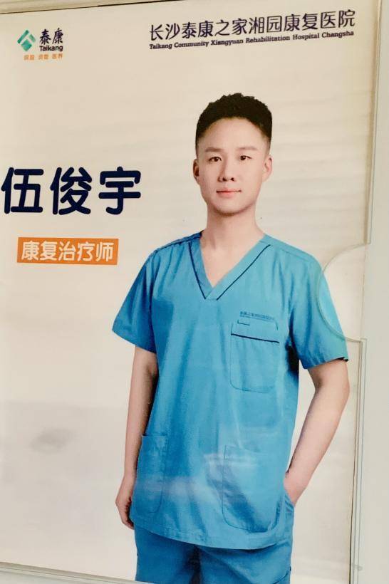 首场运动治疗结束,我扶着老伴回病房时,她告诉我:“这位技师姓伍,名俊宇,是岳阳临湘人,从中医药大学毕业后已经工作五年了。他一边给我治疗,一边跟我聊天,特别亲切。”正巧这时我们路过医院的宣传栏,上面正好有伍俊宇的照片,啊,原来是一位面容清秀、眼神坚毅的英俊小伙子!