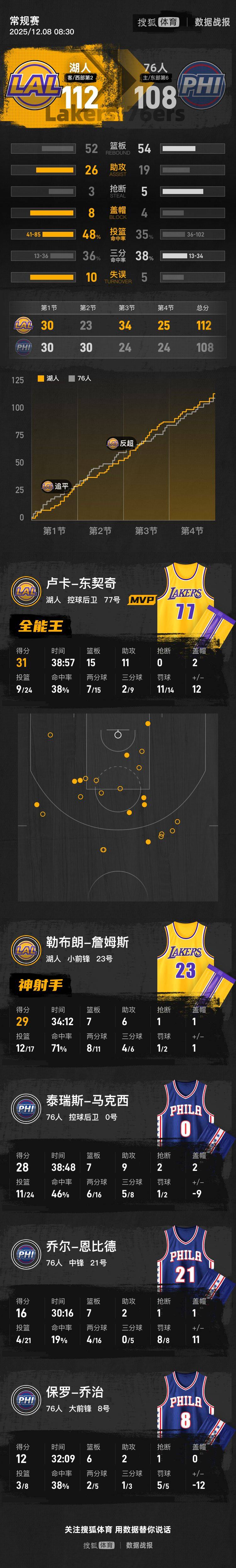 【搜狐体育战报】北京时间12月8日,2025-26赛季NBA常规赛继续进行,洛杉矶湖人客场挑战费城76人。全场打完,湖人112-108险胜76人。