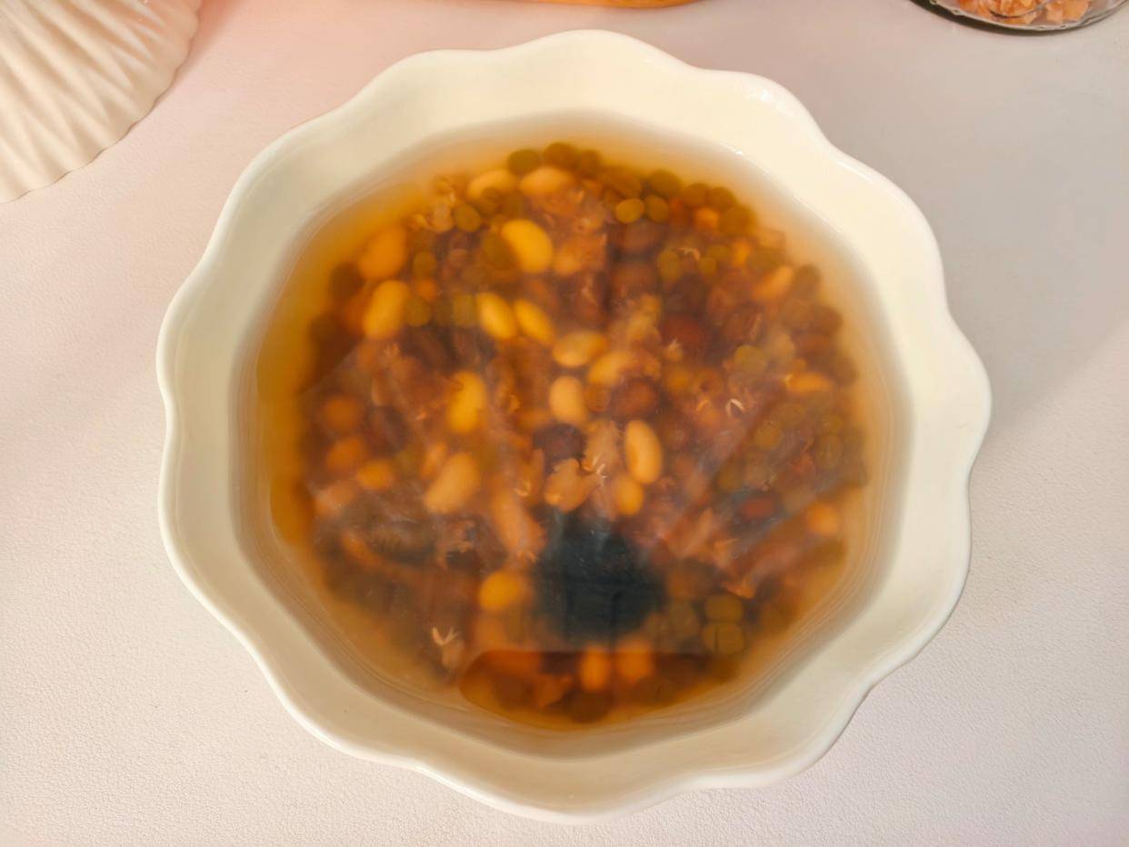 主要食材:黄豆 50克、绿豆 50克、黑豆 50克、白眉豆50克、乌梅 2颗、冰糖 适量清水2000毫升(可根据喜好调整浓淡)