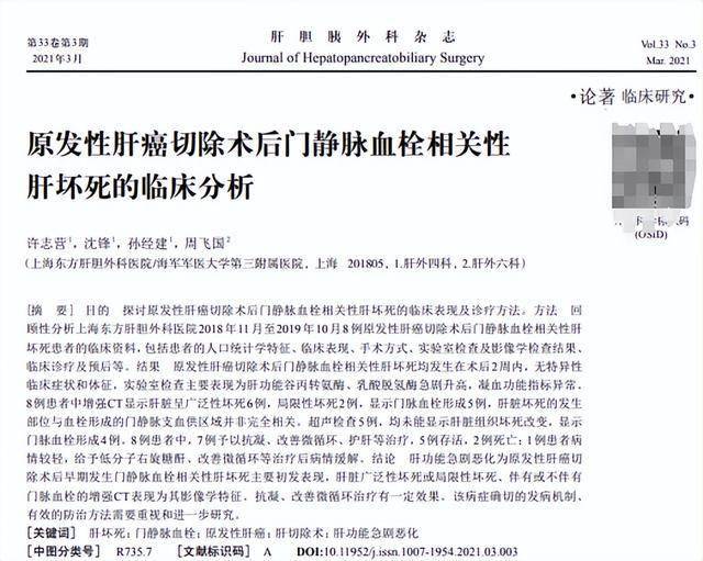 原发性肝癌切除术后门静脉血栓相关性肝坏死的临床分析 许志营;沈锋;孙经建;周飞国 肝胆胰外科杂志 2021-03-15