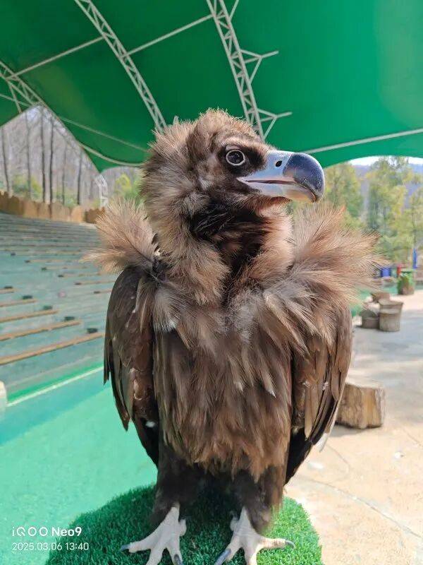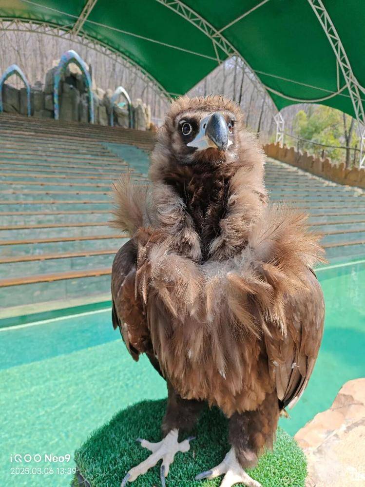 12月6日,武汉野生动物王国的猛禽饲养员王子乐向九派新闻介绍,“小秃”今年6岁,体重15斤半,是园区唯一一只秃鹫。“我们叫它‘小秃’,但它可是正儿八经的大型猛禽,翼展能到3米,在野外以大型动物的尸体为食。也被称为‘座山雕’。”