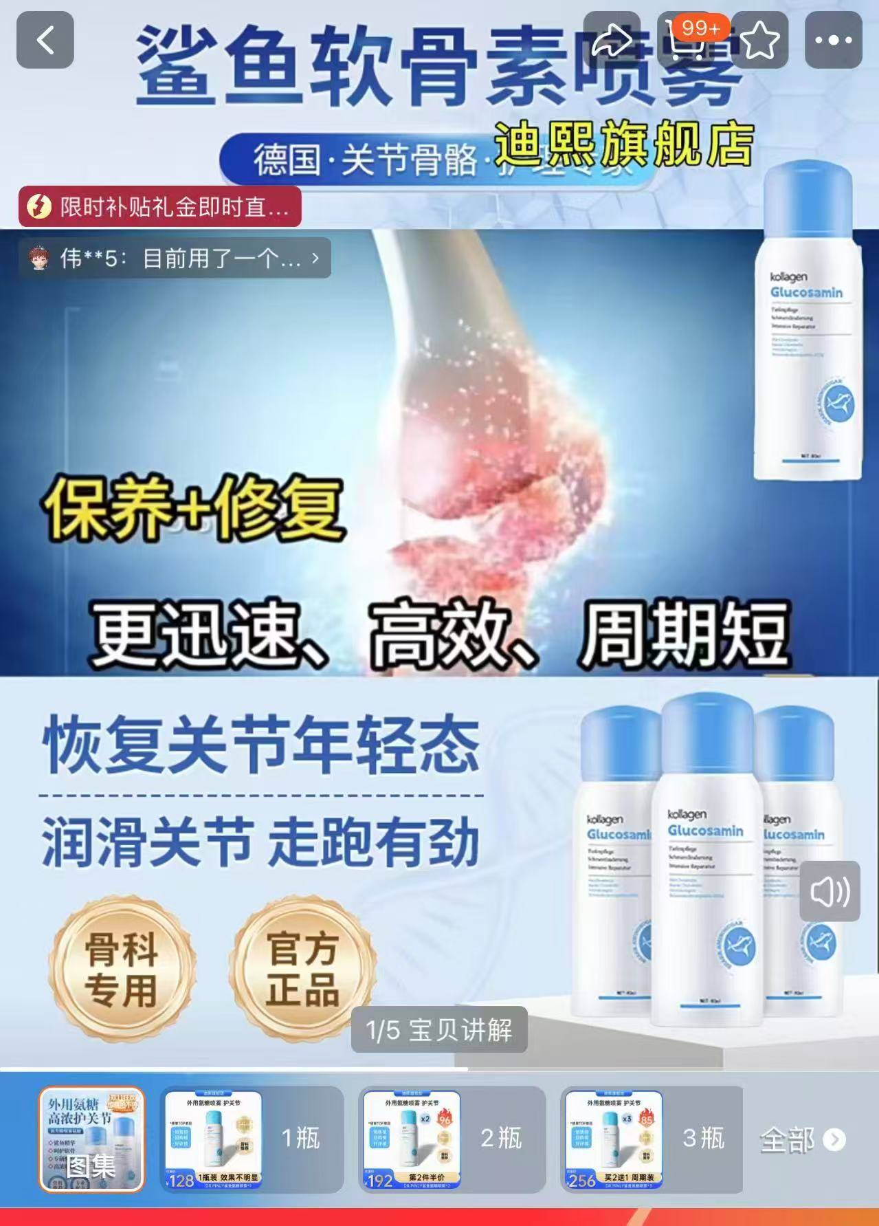 Dr.pinly鲨鱼氨糖软骨素喷雾的产品介绍页面中,目前已经删除了“10倍高浓缩吸收,可以深度呵护软骨,深层强化修护,减少运动磨损”“关节有问题就选氨糖喷雾,氨糖外用新科技,全方位直达关节深处”等表述,但在该产品的视频介绍中仍提及“运动过度、关节异常、爬楼吃力,关节信号不容忽视,这款德国鲨鱼氨糖关节喷雾添加了胶原蛋白、氨基葡萄糖、鲨鱼软骨素,草本精华和小分子提取技术,关节康复中心推荐使用;添加鲨鱼硫酸软骨素,润滑关节、修复软骨,适用全身各处关节”等功效描述。