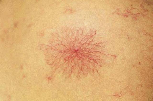 很多人在镜子前会发现:胸口、面部、上肢出现“小红点”,边缘放射状,如蜘蛛网般,医学称之为“蜘蛛痣”。用手指按压会变白,松开后恢复红色。
