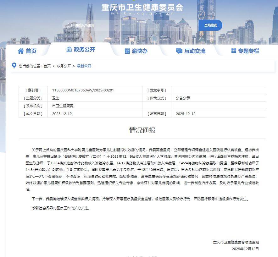 出院后,患方反映治疗药物诺西那生钠说明书记载该药物应在2℃-8℃下冷藏保存,不得冷冻,认为注射药疑似失效。经初步调查,当事医生存在违规存储药物情况,重庆市卫生健康委将依法依规对其进行严肃处理,始终以保护患儿健康和积极救治为首要原则,迅速组织相关专业专家,会诊评估对患儿病情的影响,进一步制定治疗方案,及时给予患儿专业规范救治。