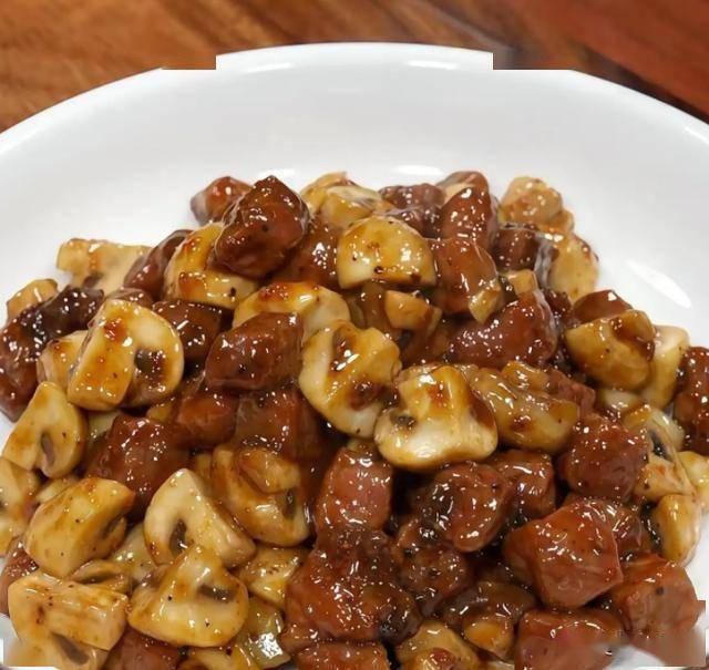 7. 倒入煎好的肉丁,加10毫升生抽,快速翻炒均匀(翻炒需迅速,使口蘑和肉丁充分裹上酱汁),炒至肉丁和口蘑入味,即可盛出装盘。