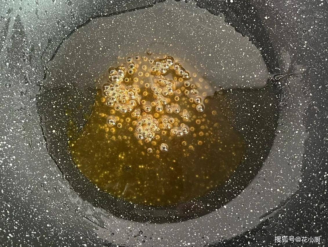 2、接着开始炒糖色。锅里倒上点油,等油热乎了,抓上适量的冰糖放进去,用铲子不停地搅拌,等冰糖慢慢融化,变成漂亮的焦糖色。放猪蹄让每一块猪蹄都裹上这诱人的焦糖色;