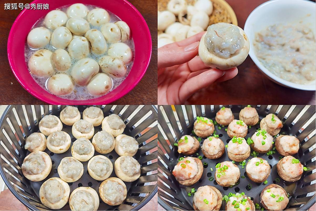 3. 把虾滑填进口蘑的“小碗”里,稍微抹圆润。