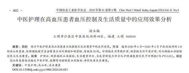 [1]汤玉楠.中医护理在高血压患者血压控制及生活质量中的应用效果分析,中国冶金工业医学杂志,2024-08-01
