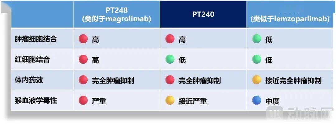 一方面,在抗CD47单克隆抗体的选择上,Phanes Therapeutics使用了三种具有不同生物学特征的抗CD47单克隆抗体,即与magrolimab类似的PT248、与lemzoparlimab类似的PT246和与众不同的PT240。
