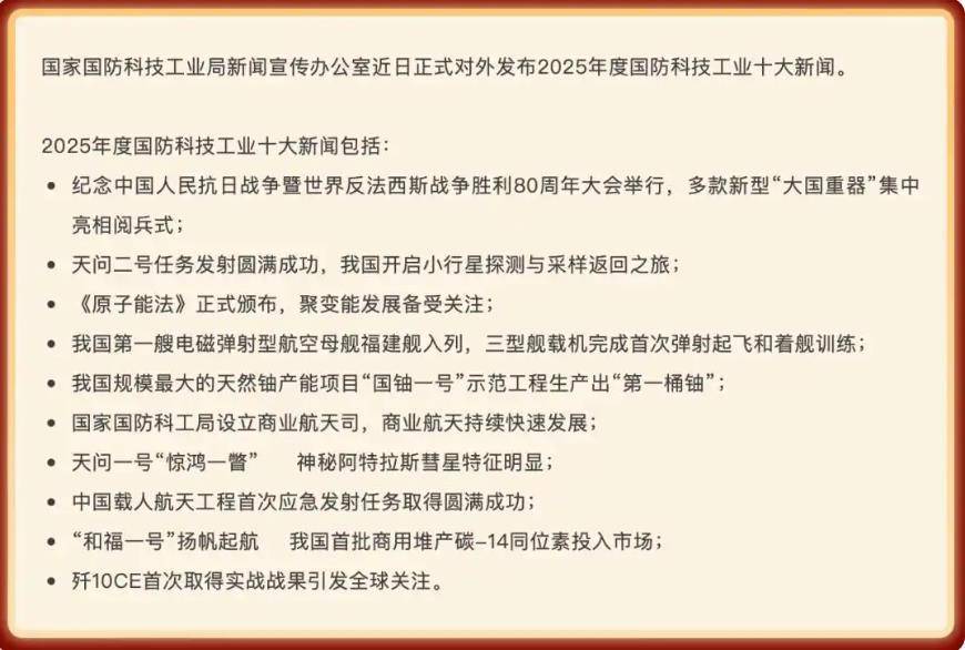 据中国军工微信公众号,国家国防科技工业局新闻宣传办公室正式对外发布2025年度国防科技工业十大新闻,其中一则新闻是《歼10CE首次取得实战战果引发全球关注》。