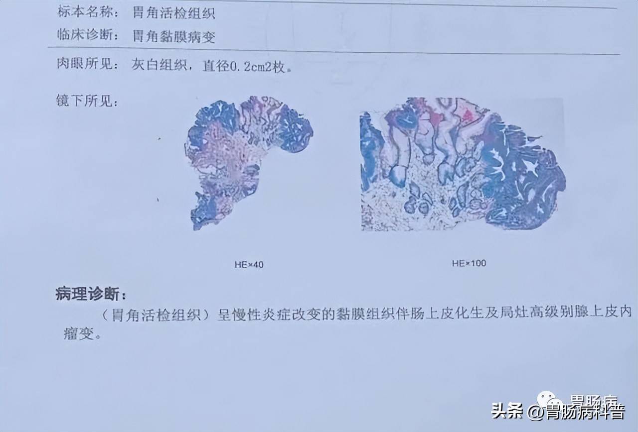 病理结果显示:(胃角活检组织)呈慢性炎症改变的黏膜组织伴肠上皮化生及 局灶高级别腺上皮内瘤变。