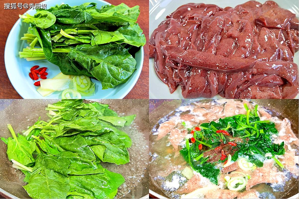 4. 立刻放入菠菜和枸杞,加少许盐和几滴香油调味,再滚开一下就可以关火了。猪肝切忌煮老。