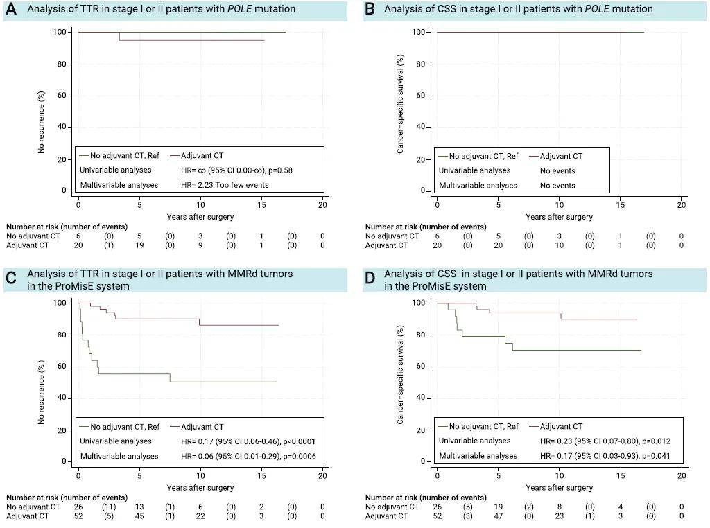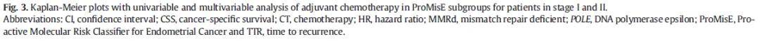 依据机构诊疗指南,大多数Ⅲ期患者接受化疗。具体而言,210例Ⅲ期患者中,173例(82%)接受辅助化疗,仅2例(1%)接受辅助放化疗。279例FIGO Ⅰ/Ⅱ期患者中,85例(30%)未接受辅助治疗,184例(66%)接受辅助化疗,其余10例(4%)接受辅助放疗或放化疗。按ProMisE分子分型亚组分层分析显示,辅助化疗可显著延长MMRd组和p53异常组患者的TTR并改善CSS,且在单因素和多因素分析中均具有统计学意义;但在POLE突变组和NSMP组中,未观察到辅助化疗的获益(图3)。