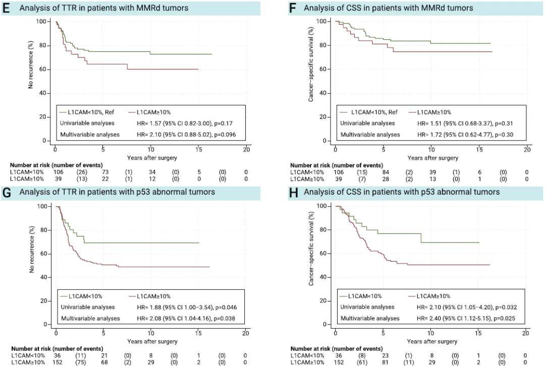 在这项纳入大样本高危患者的队列研究中,L1CAM表达水平与手术分期、LVSI、手术时年龄、组织学类型及分级、辅助治疗方案、盆腔淋巴结分期清扫术均为强效预后因素。在TTR和CSS的单因素分析中,ProMisE分子分型具有统计学意义;在TTR的多因素分析中,该分型也具有统计学意义,但这一意义仅在模型未纳入L1CAM表达水平时存在。在排除POLE突变型的MMRp肿瘤患者中,研究观察到p53异常与L1CAM高表达呈显著正相关,这与既往研究结果一致。本研究证实,无论在p53异常组还是NSMP组中,L1CAM表达水平均具有独立预后价值。p53异常且L1CAM高表达的患者远处转移发生率为40%,而p53异常且L1CAM低表达的患者远处转移发生率仅为22%。NSMP组中L1CAM高表达的患者占比相对较低,但该表达特征仍与较高的远处复发率相关。已有大量研究证实,L1CAM高表达与盆腔淋巴结转移及远处转移密切相关。本研究队列中患者的盆侧壁复发率较低,这可能与大部分患者均接受了淋巴结分期清扫术有关。远处转移患者预后极差,而阴道/盆腔中央区复发的患者通常可通过放疗实现挽救性治疗,尤其是在初次确诊时不伴高危因素的患者中,放疗疗效更为显著。正是由于L1CAM高表达的肿瘤具有较强的转移潜能,该指标才成为预测TTR缩短及CSS降低的主导因素。