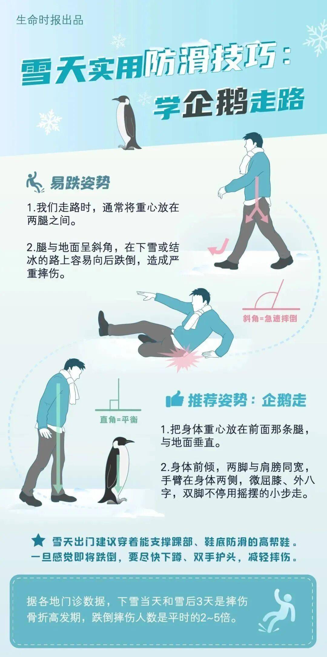 穿衣内层透气保暖、外层防水防风,加强头部、胸腹部和足部保暖,优先选深纹路防滑鞋,避免滑倒跌伤。