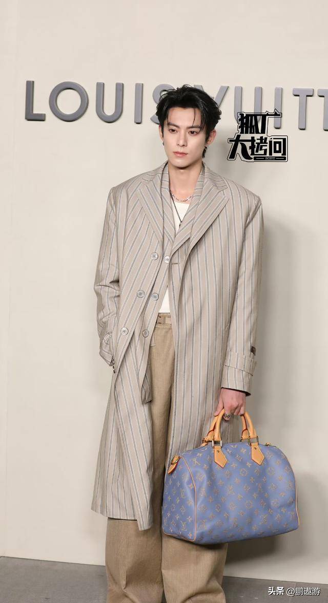 紧接着登场的是王鹤棣。他的穿搭别具一格,外面穿了一件竖条纹的风衣,内搭一件简单的白色衬衣,再配上一条宽松的裤子,整体造型清爽干净,给人一种十分清新的感觉。王鹤棣身材高挑,长款风衣让他看起来更加修长,整个人显得格外英俊。