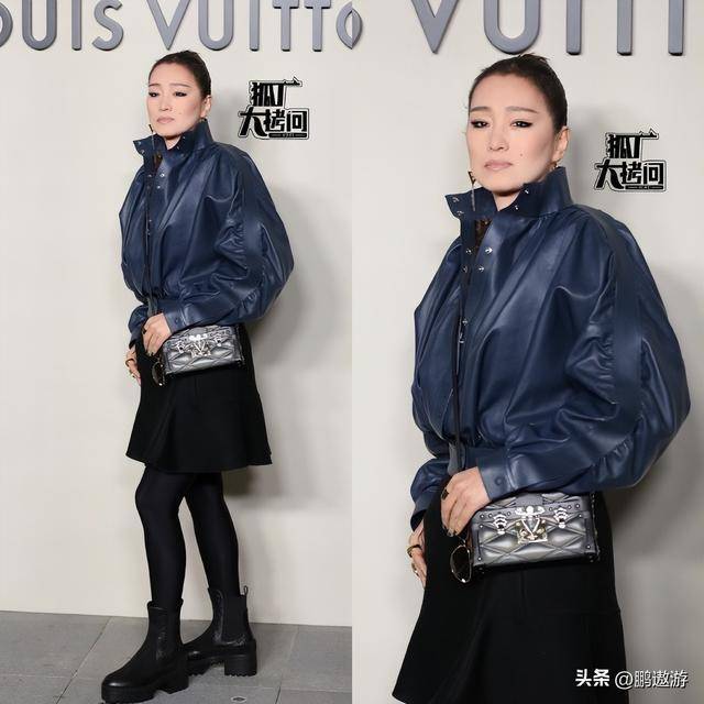 当然,活动的压轴大咖无疑是巩俐。尽管她已经60岁,但她的状态依然令人惊艳,脸上几乎没有皱纹,完全看不出岁月的痕迹。巩俐的上半身穿着一件帅气的蓝色皮衣,配上她精致的耳饰和妆容,整个人气场十足,霸气十足。在拍照时,巩俐并没有做出太多表情,眼神微微下垂,展现出一种冷静又强大的气场。唯一让人有些迷惑的是,她下半身搭配了一条裙子,这种上下不对称的搭配让人觉得有些奇怪,但无论如何,巩俐的气质依然是无可挑剔的。