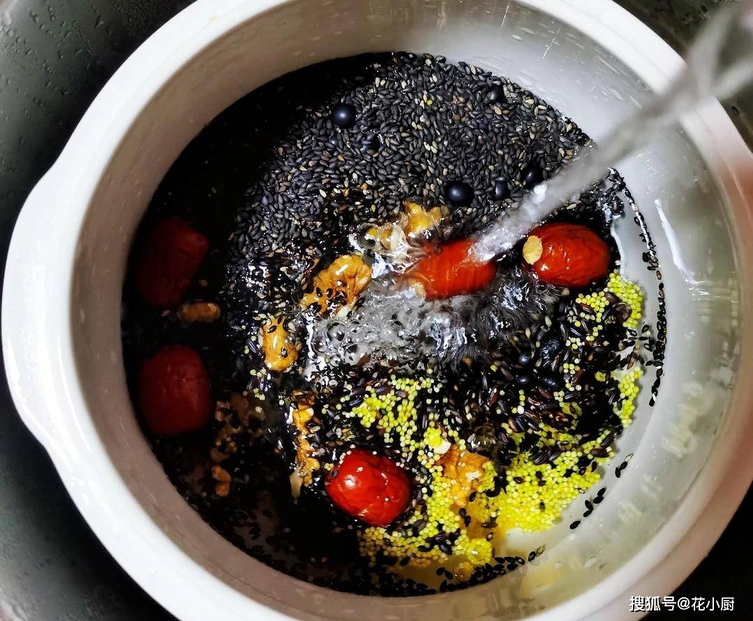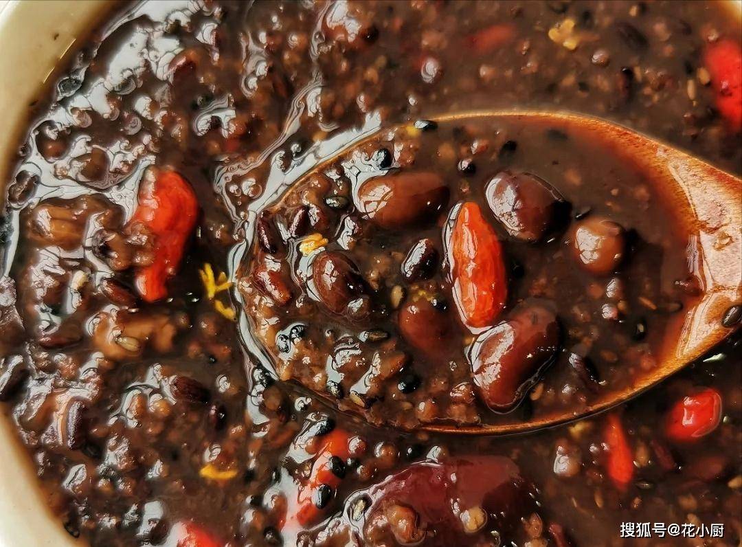 食材:黑豆、黑芝麻、核桃、小米、血糯米、红枣、枸杞、红糖