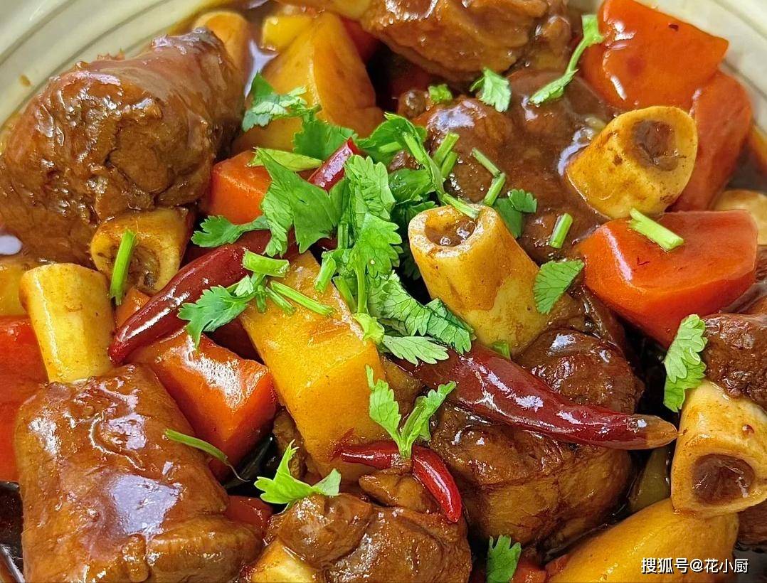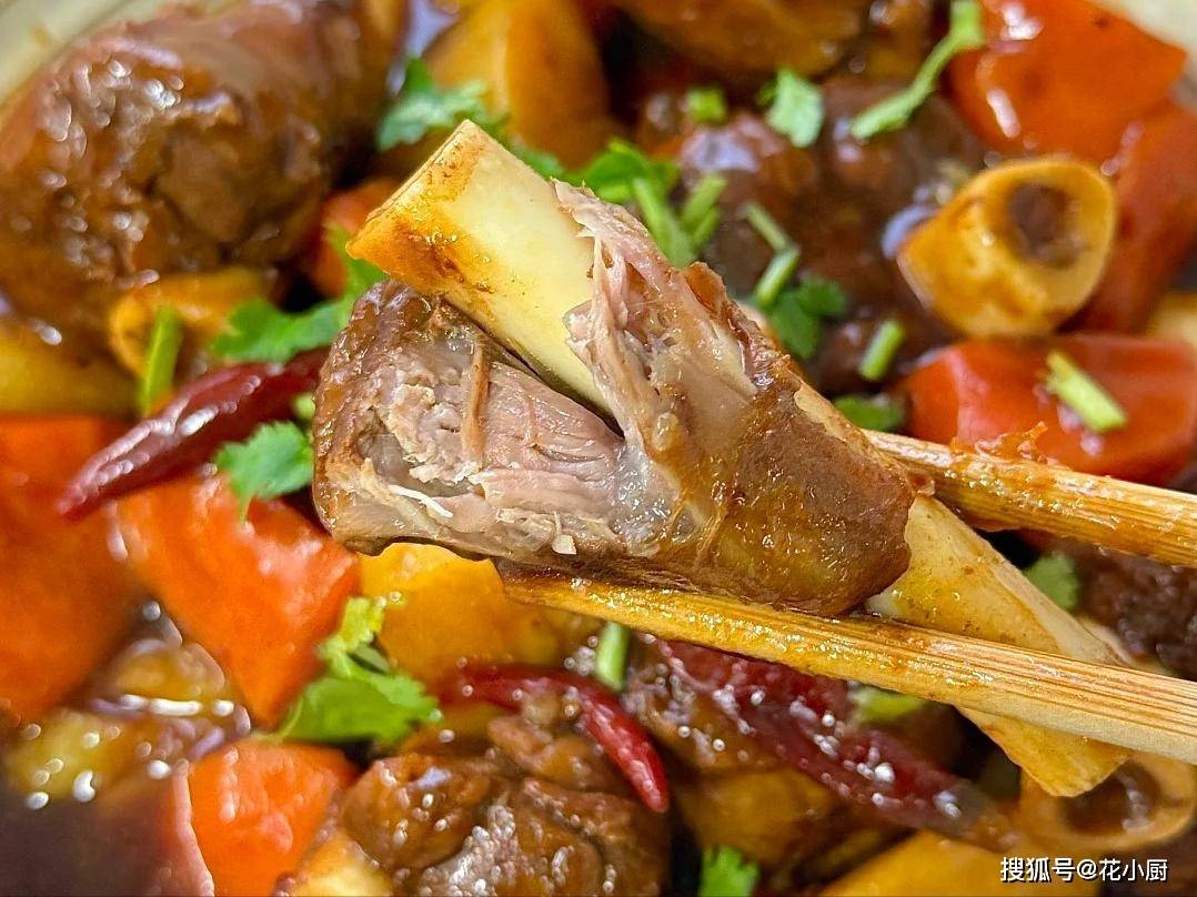 夹一块尝尝,一咬羊肉就脱骨了,一点膻味都没有,软烂入味,香得不得了。搭配上煮得粉粉的土豆和甜甜的胡萝卜,简直太下饭了,家人们一定要试试!