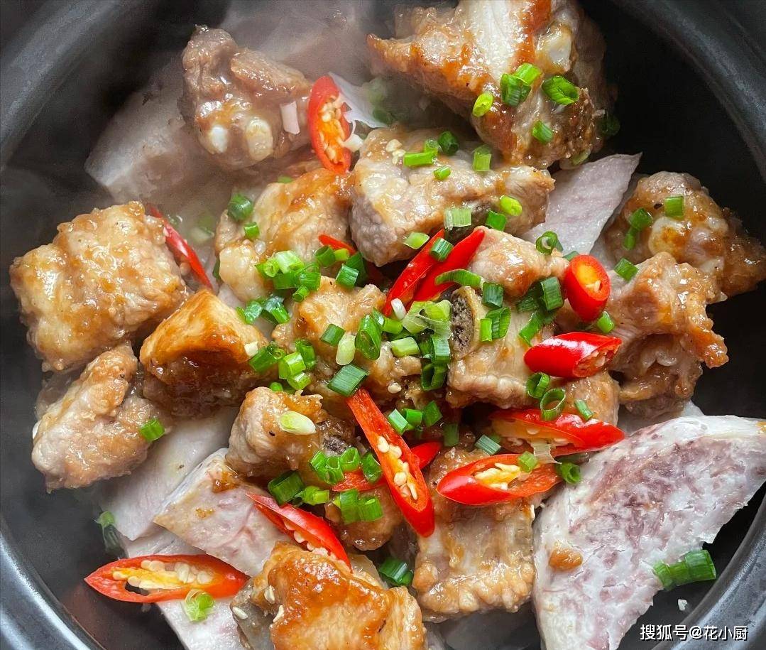 4、时间一到,打开盖子,哇,那香味 “嗖” 地一下就钻到鼻子里了。最后,撒上点葱花和小米辣,这道香芋排骨煲就大功告成啦!
