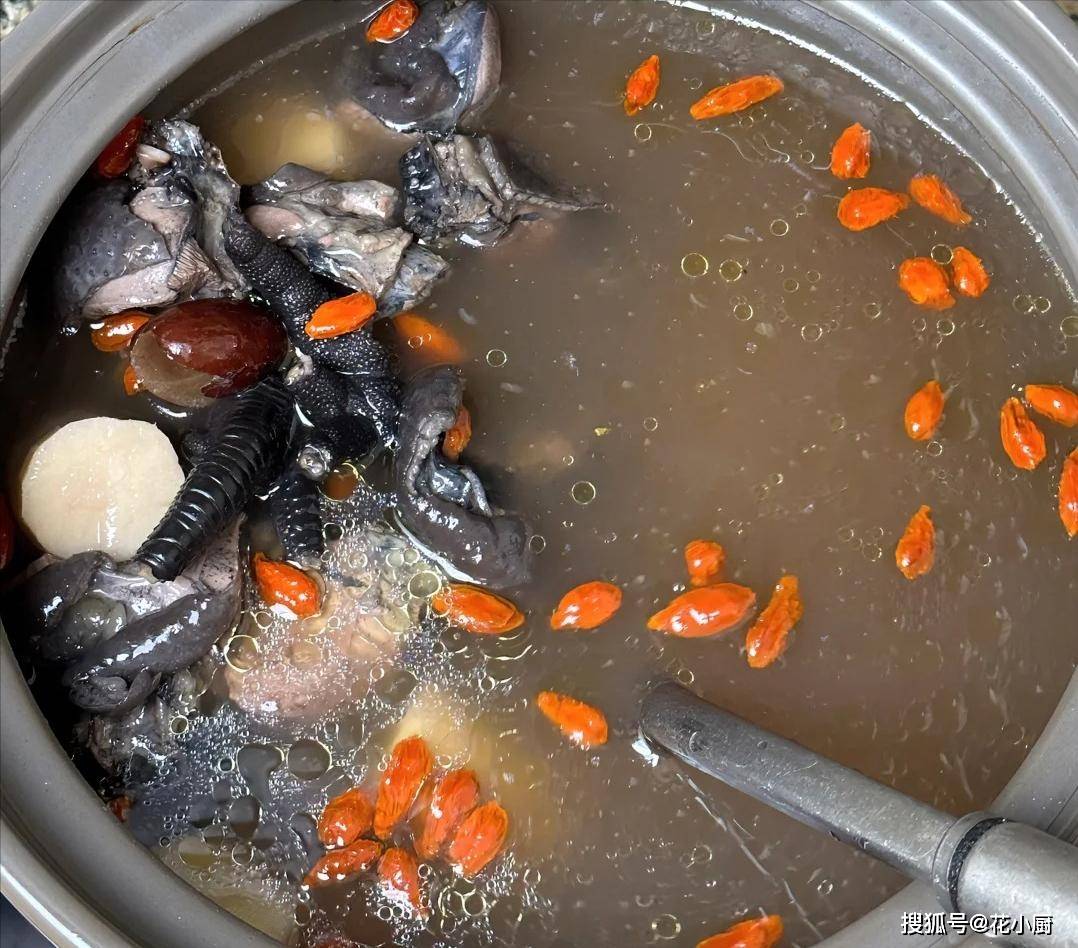 3、在煲汤的时候,咱可以想想这汤煲好之后的美事儿,一口下去,那营养不得蹭蹭往上涨啊。等汤煲了 1 个小时左右,这时候就可以把枸杞撒进去了,撒完之后盖上盖子焖一会儿,让枸杞的味儿也融入到汤里。
