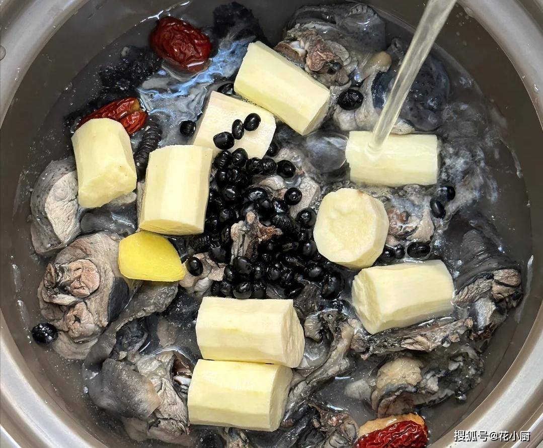 食材:黑豆 40 克、山药 200 克、红枣 3 颗、枸杞 10 克、乌鸡、生姜、盐