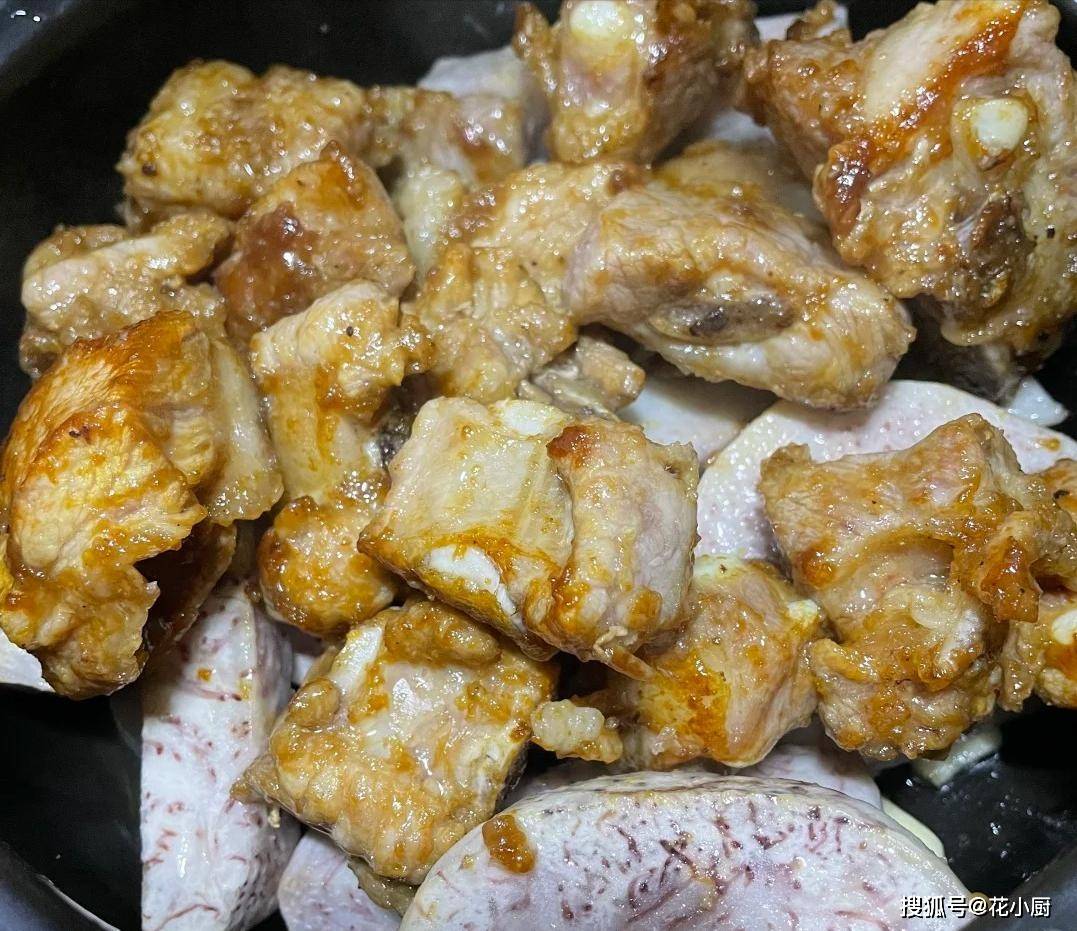 2、趁着腌排骨的工夫,咱把荔浦芋头的皮削掉,放锅里用中小火稍微煎一下。煎好后,把芋头平平整整铺在砂锅里。接着用煎芋头剩下的油来煎排骨,把排骨煎到微微焦黄,看着那颜色,老有食欲了。煎好后把排骨盖在香芋上,别忘了把刚才腌排骨的料汁也一股脑倒进去。