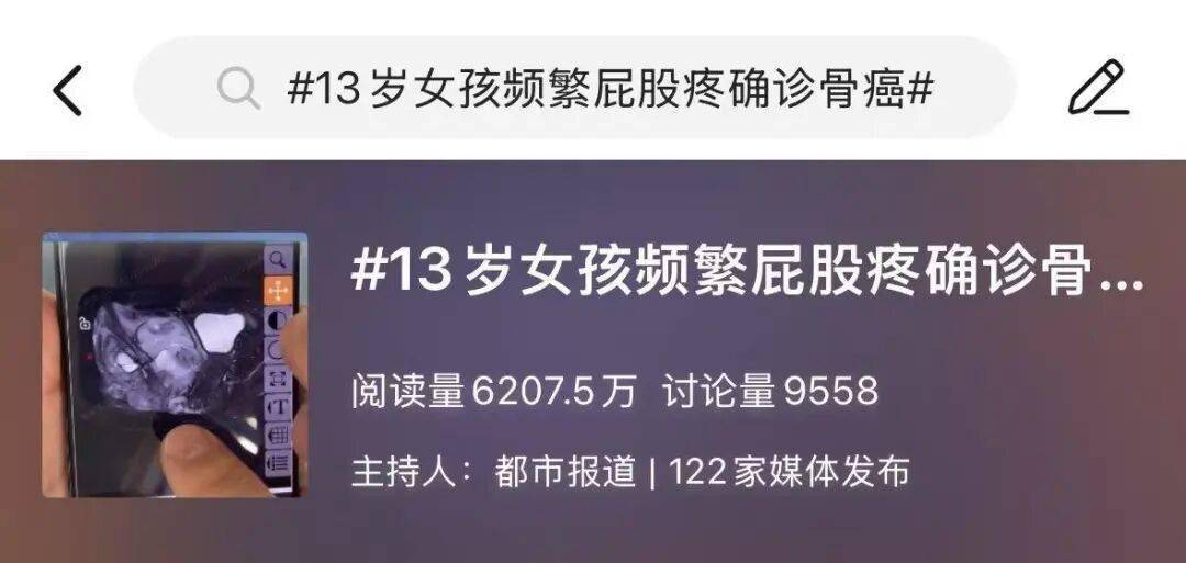 近日,一则令人揪心的新闻冲上热搜:一名13岁的女孩因“屁股疼”就医,最终竟被确诊为骨癌。