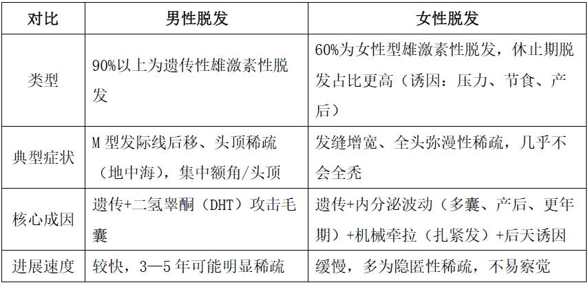 男性与女性脱发在核心特征上差异显著,且不同年龄段的表现和诱因各有侧重,具体可清晰区分: