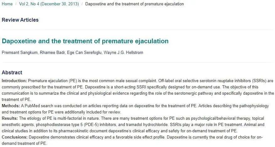 2013年12月,Sangkun P.在Transl Androl Urol上发表题为:《Dapoxetine and
