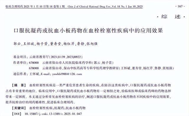 口服抗凝药或抗血小板药物在血栓栓塞性疾病中的应用效果,郭云;王怀斌;杨子萱;董寿堂;杨红芹,临床合理用药,2025-01-08