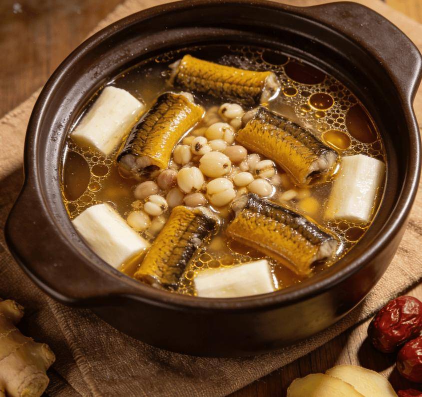 芡实淮山炖黄鳝是江淮地区冬季的经典温补膳品,适配当地冬季湿冷、多雾的气候特点。江淮一带水域辽阔,黄鳝资源丰富,当地民间素有“冬吃黄鳝赛人参”的说法,中医认为黄鳝味甘,性温,能补益气血、强筋健骨、温脾止泻,尤其适合冬季气血不足、脾胃虚寒人群;铁棍淮山味甘性平,补脾养胃、生津益肺,是江淮地区冬季常用的养脾食材;芡实甘涩性平,补脾止泻、益肾固精,能化解黄鳝的滋腻,同时增强健脾祛湿功效;红枣调和气血,枸杞滋阴养血,让整道膳品温而不燥、补而不滞。慢炖后,黄鳝肉质细嫩脱骨,汤汁吸收了食材的鲜醇与营养,口感清甜温润,既能驱寒暖身,又能养护脾胃,贴合江淮地区“冬季温养、以食御寒”的食俗,是全家共享的冬季家常佳品。