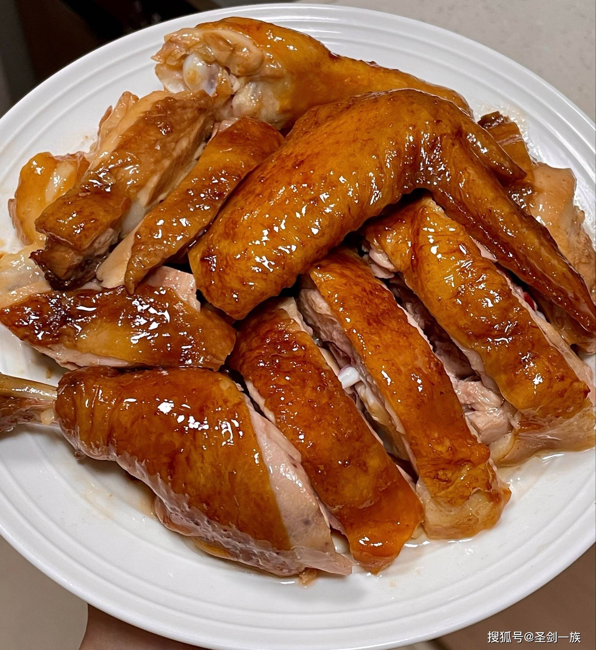 3.这里有个讲究——三浸三起工艺。把鸡放入汤汁浸一会,再提起来,反复三次。这样能让鸡皮和鸡肉都充分入味。
