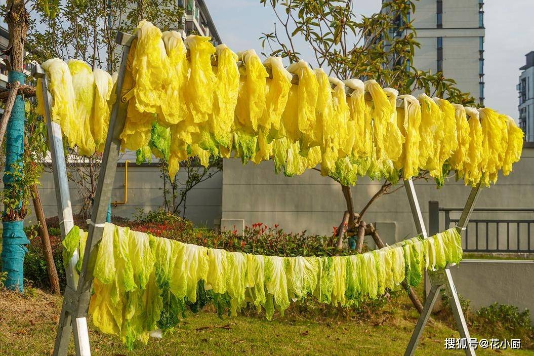 3、沥干水分后就可以拿到外面去晒干了。晒白菜干记得提前看好天气,冬天的太阳虽然不如秋天,但风大,所以只要不是下雨天,就基本没有关系,不过有太阳是最好,可以缩短晾干的时间,晾干白菜的时候最好是挂起来,这样更容易风干。