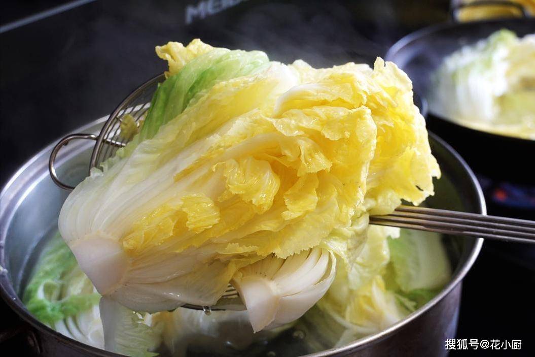 2、起锅烧水,水沸后加入一小勺食盐——这不仅能保持白菜的翠绿,还能初步渗透底味。先用筷子夹住白菜梗部,在沸水中浸烫10秒,待坚硬的菜梗微微透明,再将整株白菜完全浸入计时1分钟;