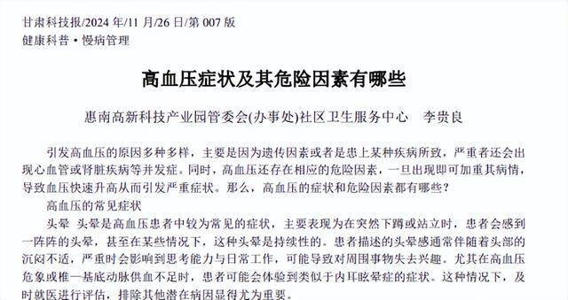 高血压症状及其危险因素有哪些 李贵良 甘肃科技报2024-11-26