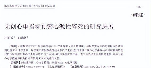 无创心电指标预警心源性猝死的研究进展,庄丽媛;王新康,临床心电学杂志,2024-12-15