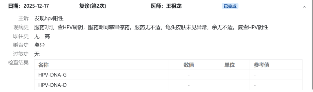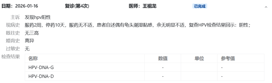 复查HPV感染情况为阴性,嘱患者服药2周,再次复查。