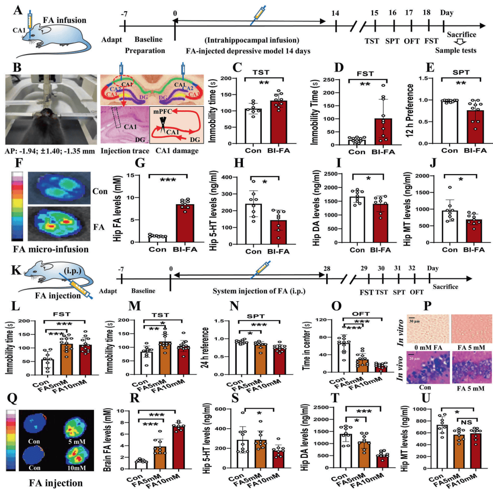 FA直接诱发抑郁行为:海马内直接注射FA(10mM,14天)诱导小鼠抑郁样行为:悬尾和强迫游泳不动时间延长,蔗糖偏好降低。FA注射组海马5-HT、DA、MT水平显著下降,且FA荧光强度与抑郁行为严重程度正相关。