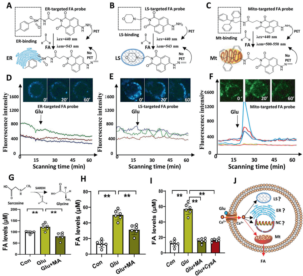 FA的神经元来源定位:兴奋性神经递质谷氨酸(Glu)可特异性诱导线粒体FA生成,而非内质网或溶酶体。Ca2+螯合剂BAPTA和线粒体通透性转换孔抑制剂CysA可阻断此过程,证实FA生成依赖Ca2+流入和线粒体SARDH酶活性。