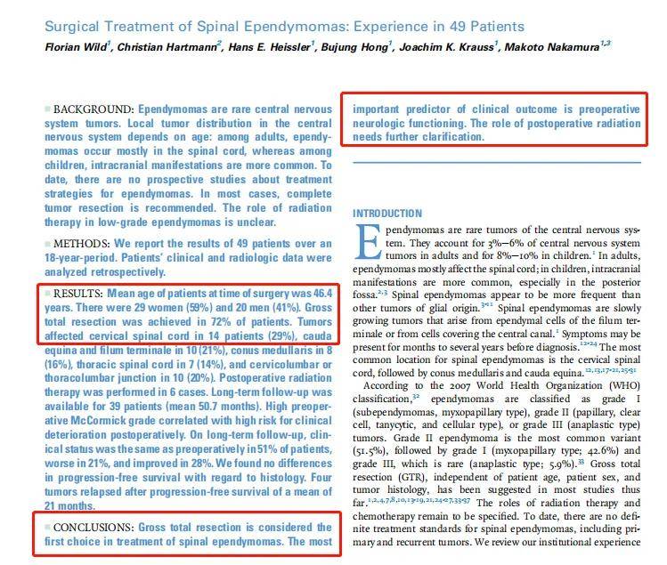 Krauss教授在《脊髓室管膜瘤的手术治疗:49例患者经验》研究中指出,全切除是治疗脊髓室管膜瘤的首选方法,在疾病早期、神经症状较轻时进行手术预后较好。