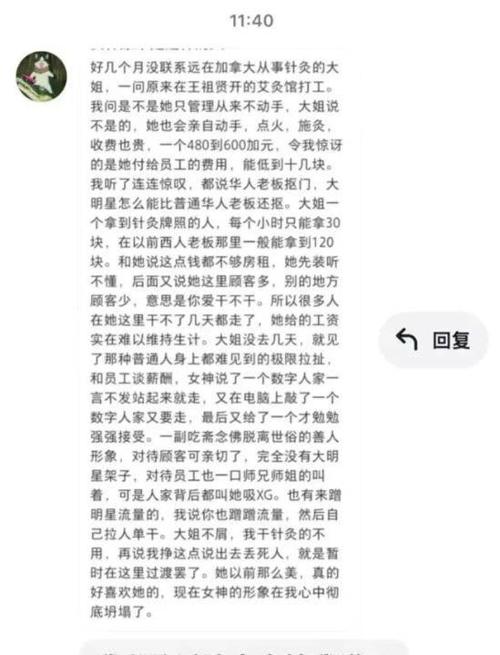 除了王祖贤的容貌引起网友关心之外,要属她的艾灸馆更让人好奇,最近她开的艾灸馆深陷舆论漩涡,她开设的名为 “灸觉” 的艾灸馆,有自称是艾灸馆员工的网友爆料,指责王祖贤压榨员工,比其他店的同样员工工资给的低很多,