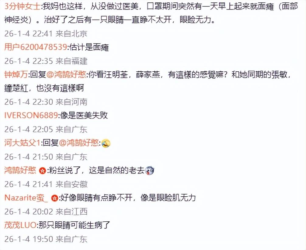 有懂医学的网友表示,王祖贤的病这种现象为“眼睑肌无力”,也有人说,王祖贤左眼的状况与其母亲的经历相似,突然之间就患上了面部神经炎,也就是面瘫,与此同时,也有肉人怀疑她是医美失败,