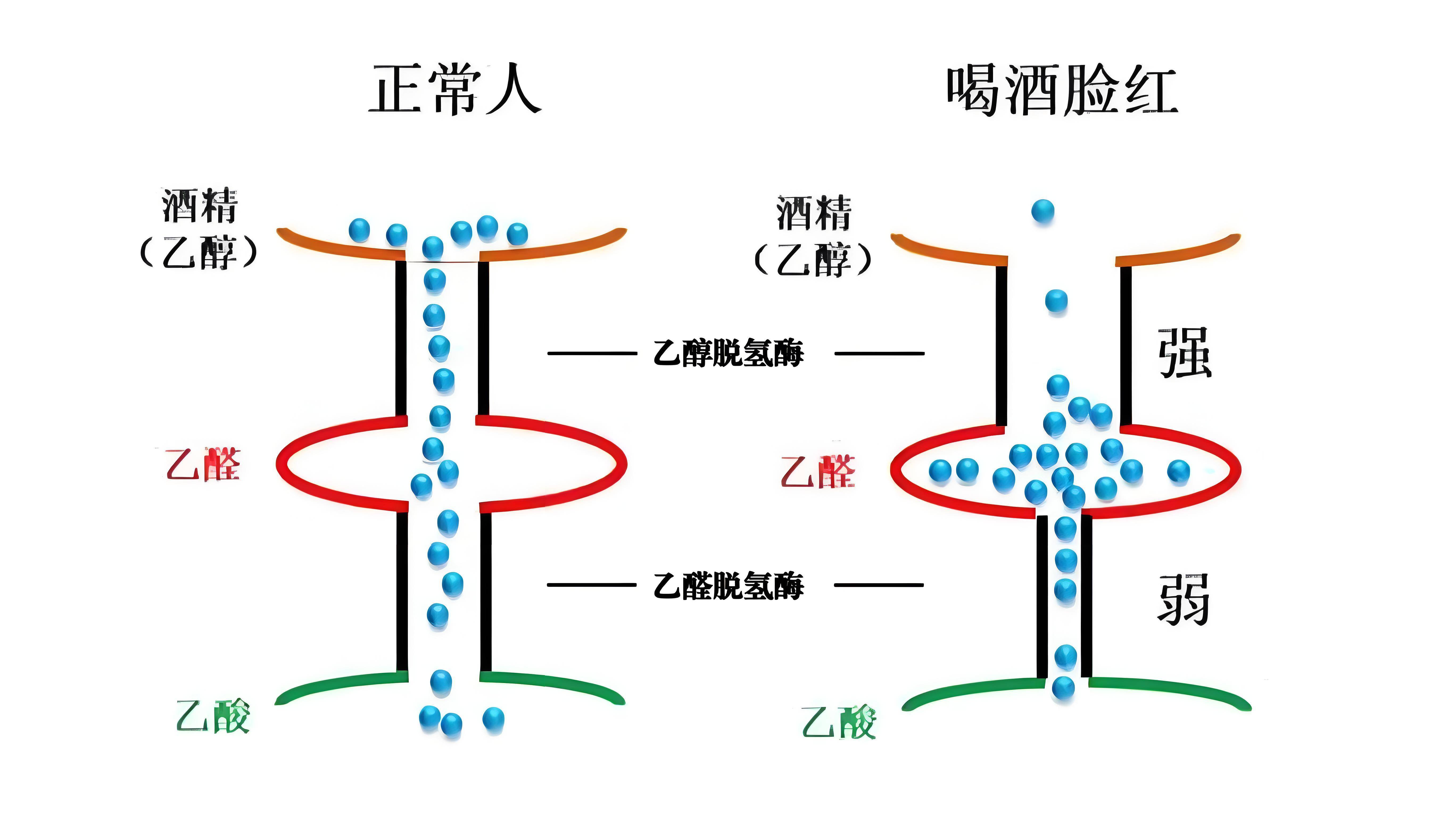 酒精在体内代谢分两步:第一步,乙醇脱氢酶将酒精转化为乙醛;第二步,乙醛脱氢酶将乙醛转化为无毒的乙酸。对喝酒脸红的人来说,问题出在第二步。