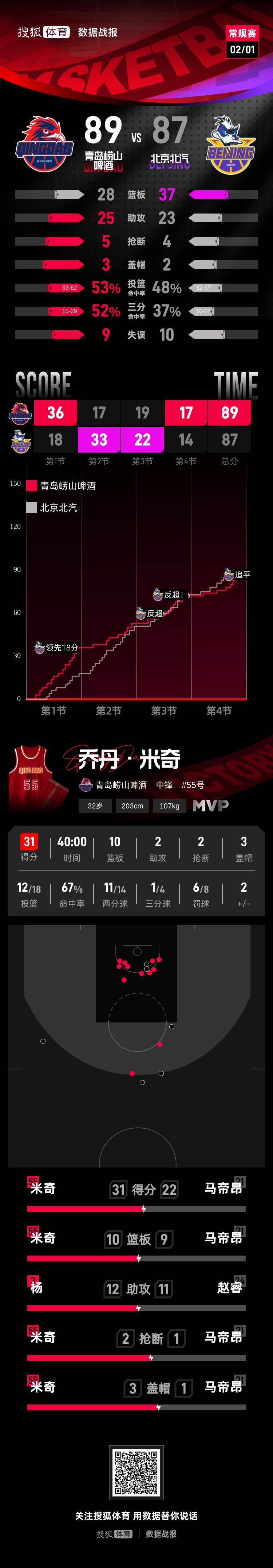 【搜狐体育战报】北京时间2月1日CBA常规赛第22轮,赵睿最后时刻关键2次罚球不中,陈盈骏和斯佩尔曼的投篮绝杀三分未果,主场作战的北京首钢87-89不敌青岛遭遇2连败。乔丹·米奇31分10篮板2助攻,赵睿10分5篮板11助攻。